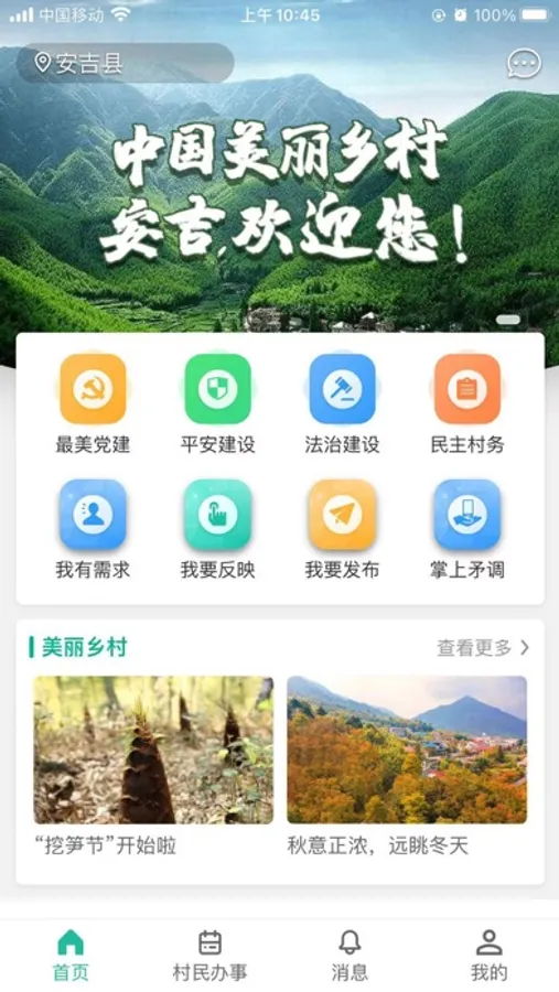 安吉掌上生活 ,主要以老百姓日常生活中能应用的内容为引领来设置相关功能及界面,移动端突出我有需求、我要反映、我要发布、信访代办、村民办事等老百姓常用功能,融合党建、平安建设、法治建设、民主村务等实用内容,打造老百姓能用、想用、会用具有生命力的手机软件。