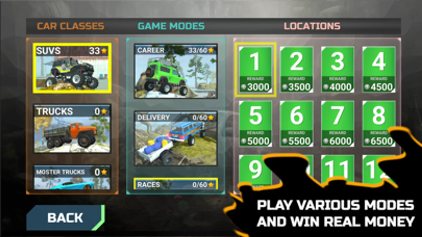Off-Road Champion introduces an innovative reward system that offers the chance to win real cash, crypto, or Amazon gift cards. By dominating the competition and consistently outperforming your opponents, you can earn valuable rewards that go beyond in-game achievements. Let your off-road skills pay off and enjoy the thrill of competing for tangible prizes.