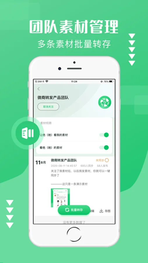 素材一键同步到朋友圈,每条多少代理同步过、多少代理转存过、是否已经同步都能一目了然;代理可以批量把你的素材同步到他们自己的团队和他们的朋友圈;一键从微信朋友圈、淘宝、京东、阿里巴巴等平台导入商品素材。