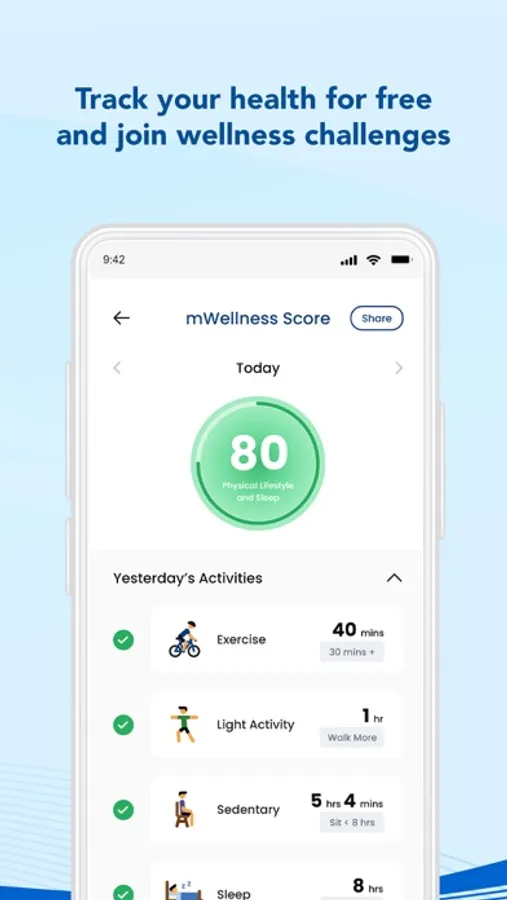 Track your wellness level right from your mWell app for FREE! A PH first and exclusive, the mWellness Score measures daily physical activity, sedentary behavior, and sleep, allowing you to live healthier. mWellness Score monitors your overall fitness level by using your physical activity data from your connected fitness tracker or the Apple Health app.