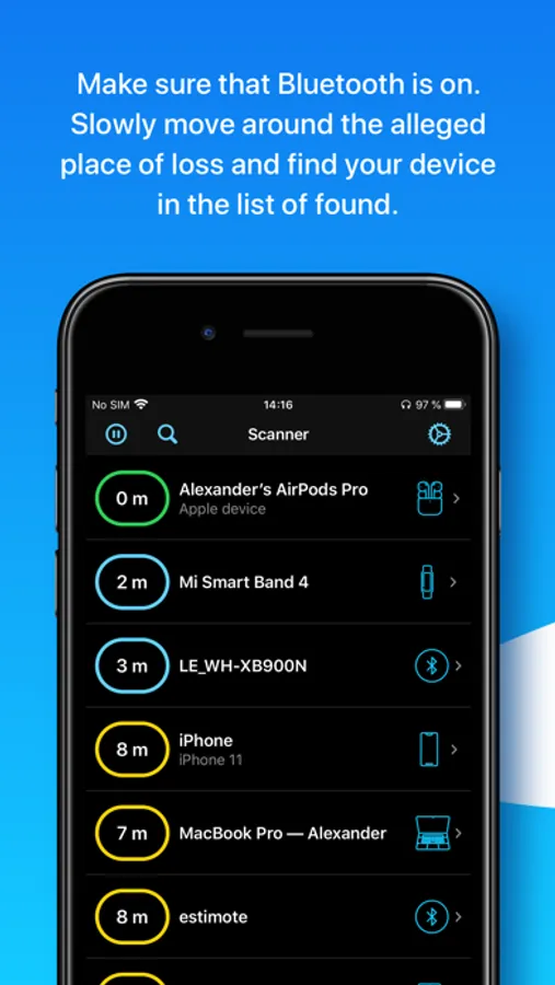 In the application you’ll see a list of Bluetooth devices around you and the approximate distance to them. Also, a device name, manufactured name, device type, if such information can be retrieved from a Bluetooth device. You’ll be able to go to a screen with a distance sensor, which will be useful for you when searching.