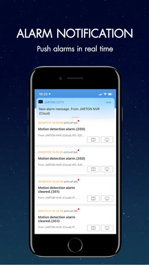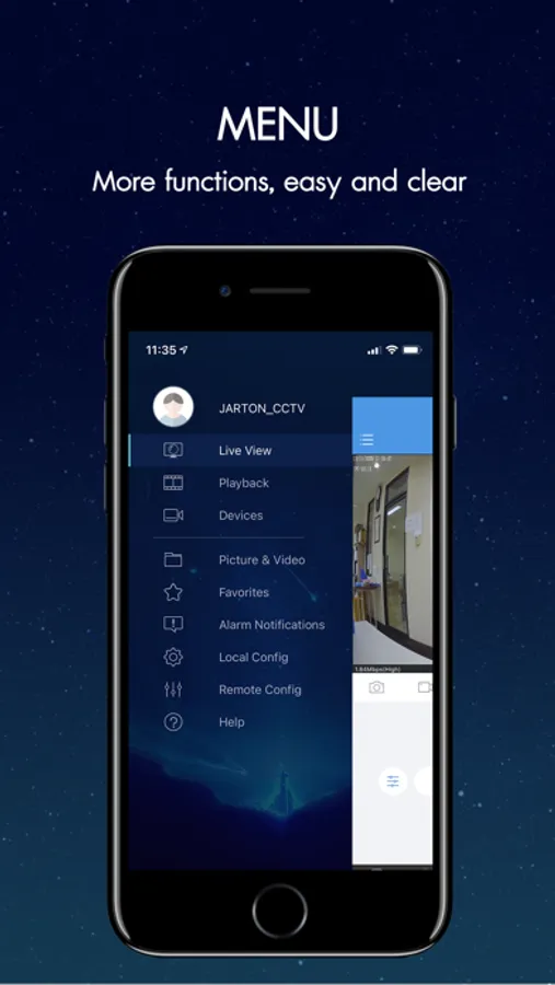 JARTON CCTV is a mobile surveillance app. With this app you can access JARTON surveillance products through network and view live or recorded video, receive alarms and manage cloud devices using your mobile phone.