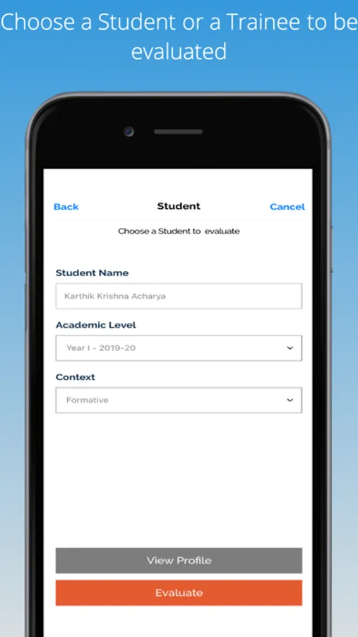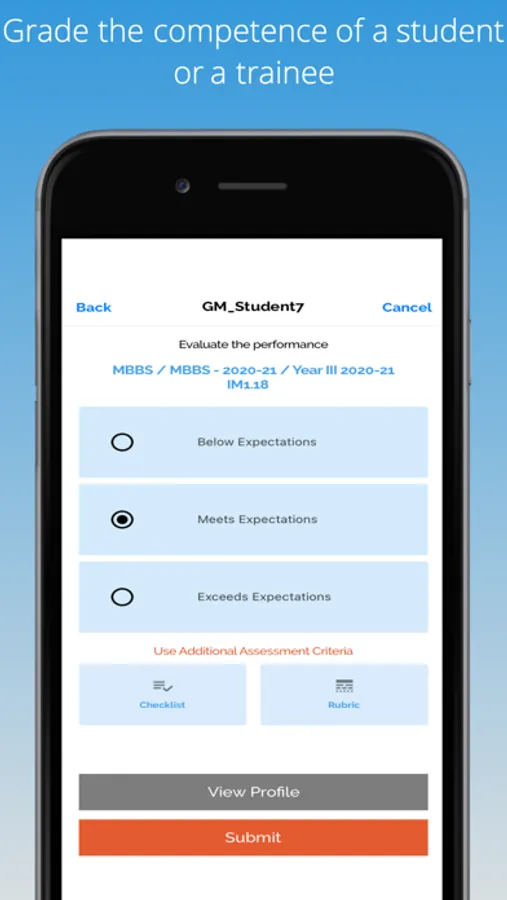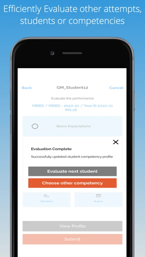 SELECT and EVALUATE LEARNER: One-tap access to quickly search and select a learner(or a small group of learners). Teachers can use checklists and rubric to quickly assess learners while the task is being performed in real-time. As soon as the observation is done the teacher can submit an evaluation of the learner's mastery level. This can be done in a formative or a summative context. Log of evaluations, based on all the attempts made by the learner, are centrally stored on a server. App also provides one-click access to enrolled learners and their competency profile.