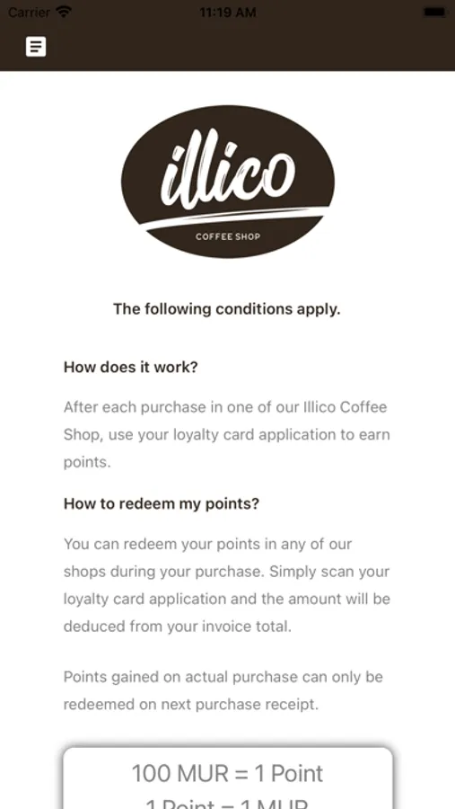 The Illico Loyalty Card is an application that has been created in order to allow Illico customers to earn points on their purchase in any of our Illico Coffee Shop and redeem those points at any time during their purchase.