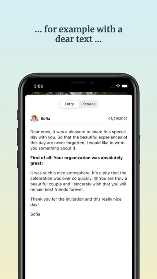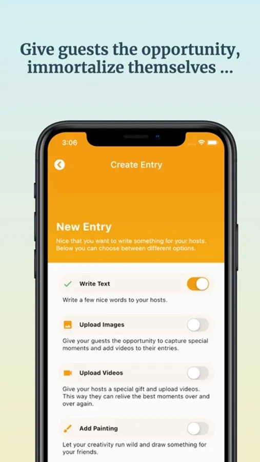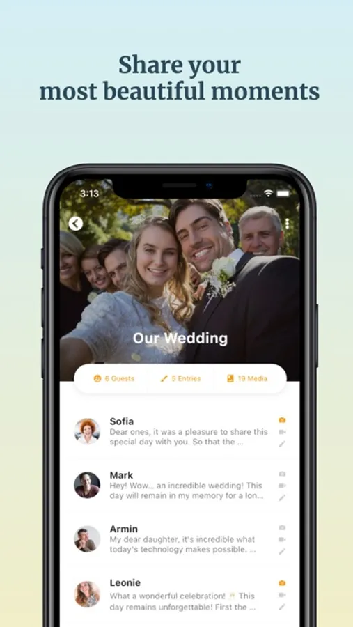 You have all pictures in one place and you can decide if only you or your guests can see the entries. You have unlimited access to your albums. In addition, no registration is necessary. This makes the app easy and usable for everyone!