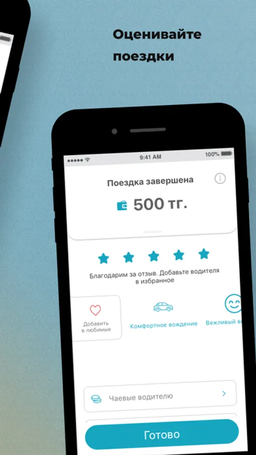 Оценивайте поездку с помощью готовых шаблонов. Занесите водителя в “Избранные”, если понравилась поездка или оставьте чаевые.