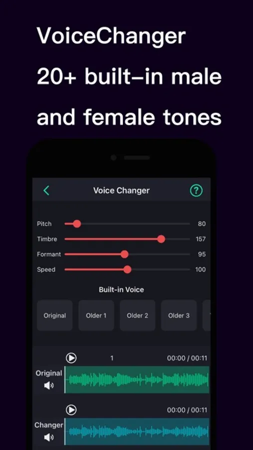 - Professional voice changer: This voice changer function focuses on human voice changer, adopts a new voice changer algorithm, which can change the voice into another person's voice (unlike ordinary robot voices, etc.), the sound is natural. There are more than 20 built-in timbres to choose from, and it also supports modifying parameters such as pitch & formants to generate other timbres.