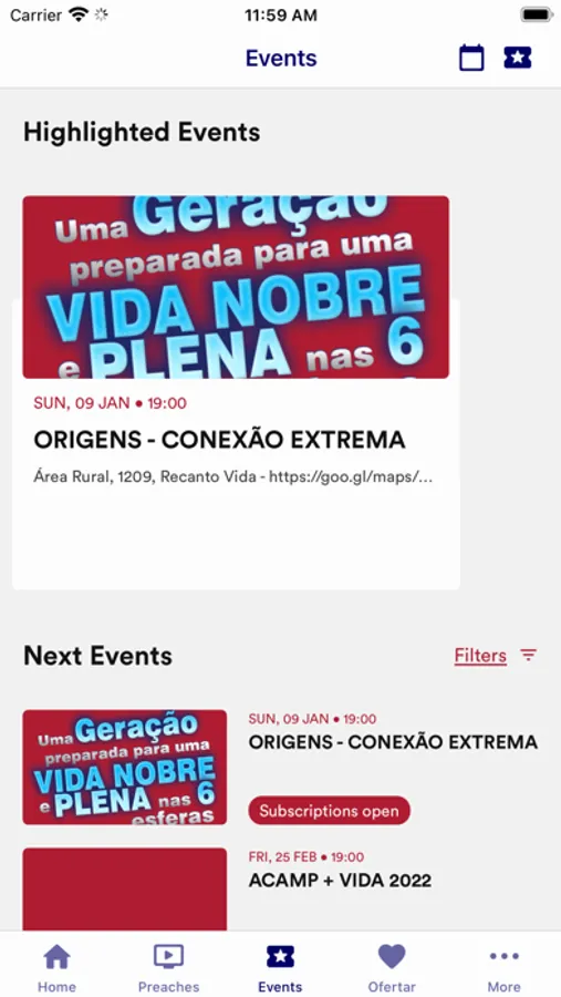 - Siga a agenda e fique por dentro de tudo que acontece na igreja, inscreva-se em eventos e tenha seus ingressos sempre com você.