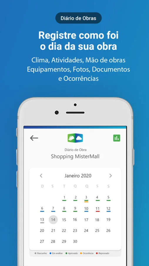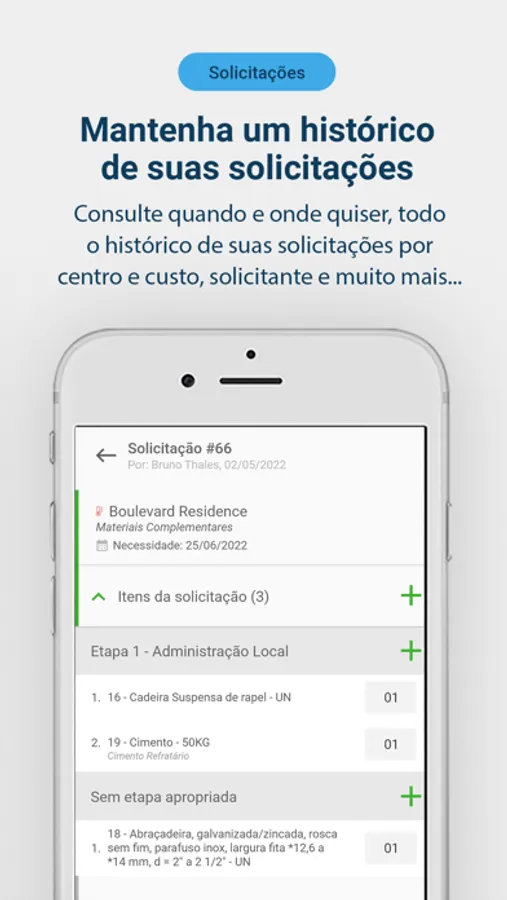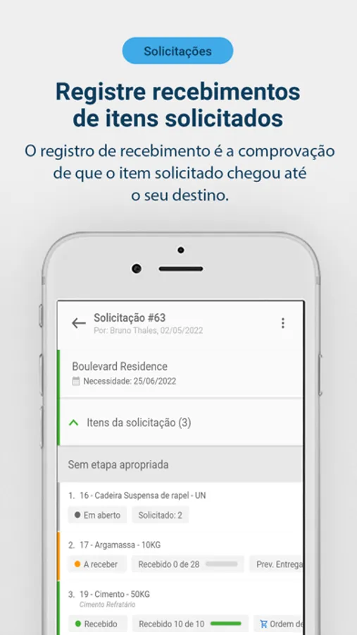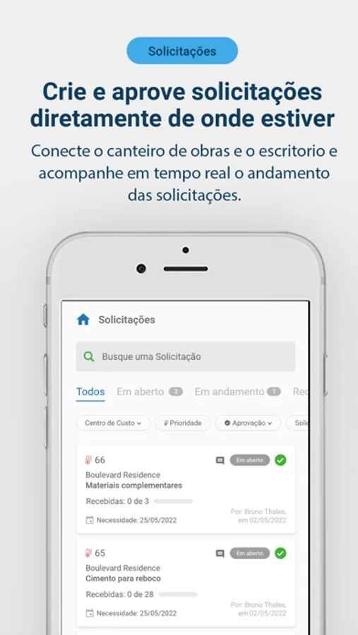 Além de diversas funcionalidades que ajudam você a economizar tempo e dinheiro no processo de gerenciamento de obras, o nosso aplicativo contém as rotinas de Solicitações de Compras e Relatório Diário de Obras que são ferramentas essenciais para quem está no dia a dia da obra e precisam acessar essas informações a qualquer momento.