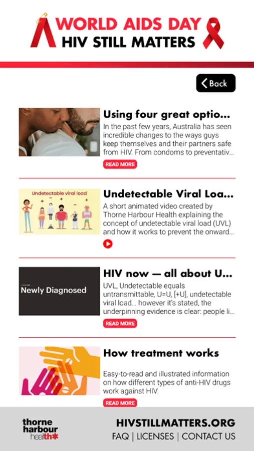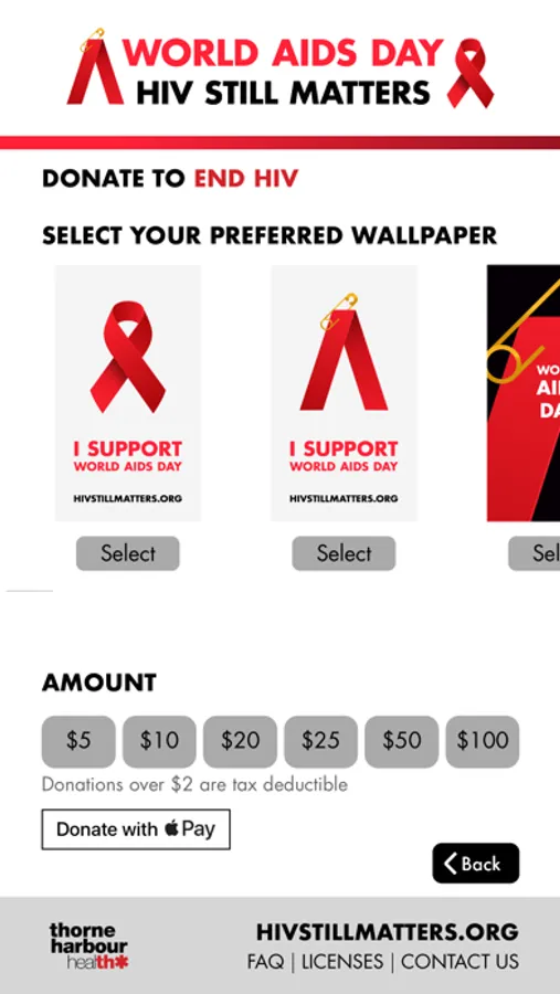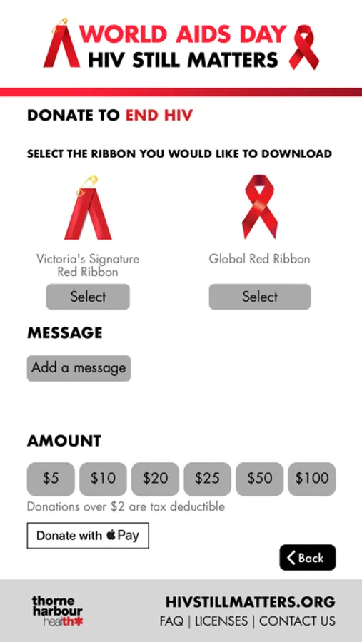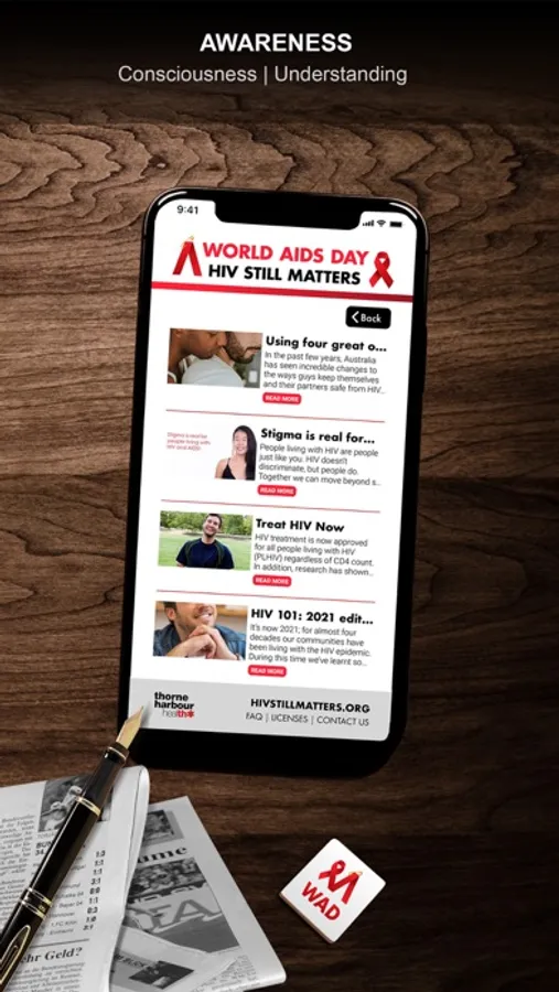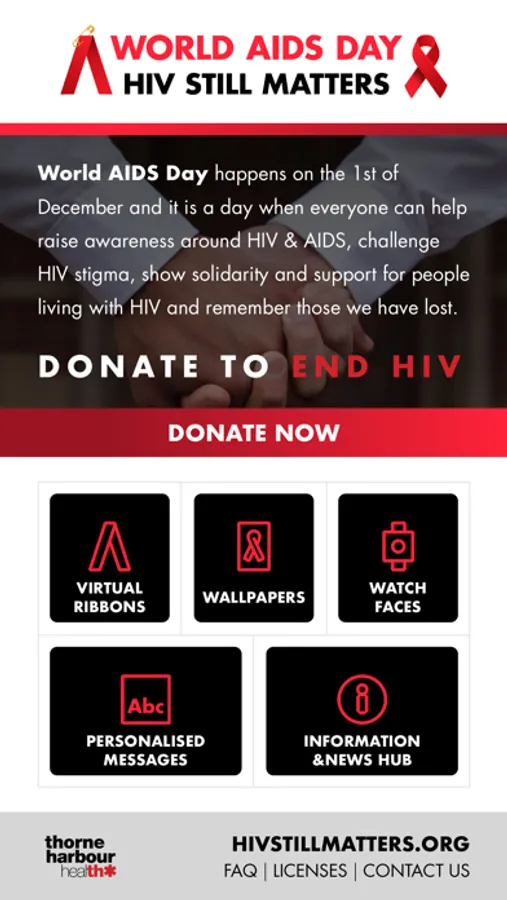 The World AIDS Day (WAD) is an app from Thorne Harbour Health to raise vital funds to end HIV stigma, prevent new HIV transmissions and support people living with HIV. The latest release of our WAD app allows users to download virtual ribbons, wallpapers, watch faces, create personalised messages which can be shared on social media, and access information and news through our resource hub. All our downloadable features help us raise money through your donation to support people living with HIV.