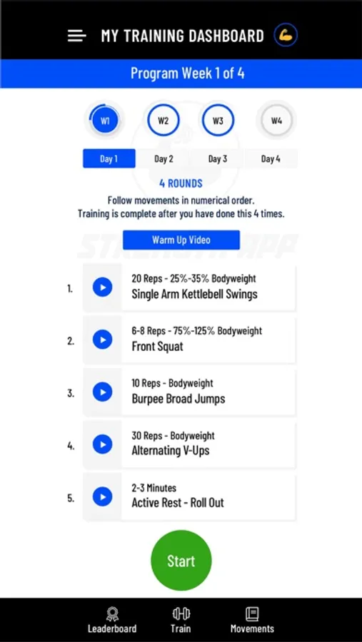 After you sign up for a free 30-day trial, you will be provided a custom strength training plan based on your bio measurements and physical assessment. The physical assessment measures your broad jump distance and plank hold time to generate your Strength Score. Your Strength Score unlocks your custom strength program that cycles every 4 weeks, at 4 days per week. Each day, Strength App will provide you with a new custom workout consisting of 4 movements, to perform 4 rounds before your workout is complete.