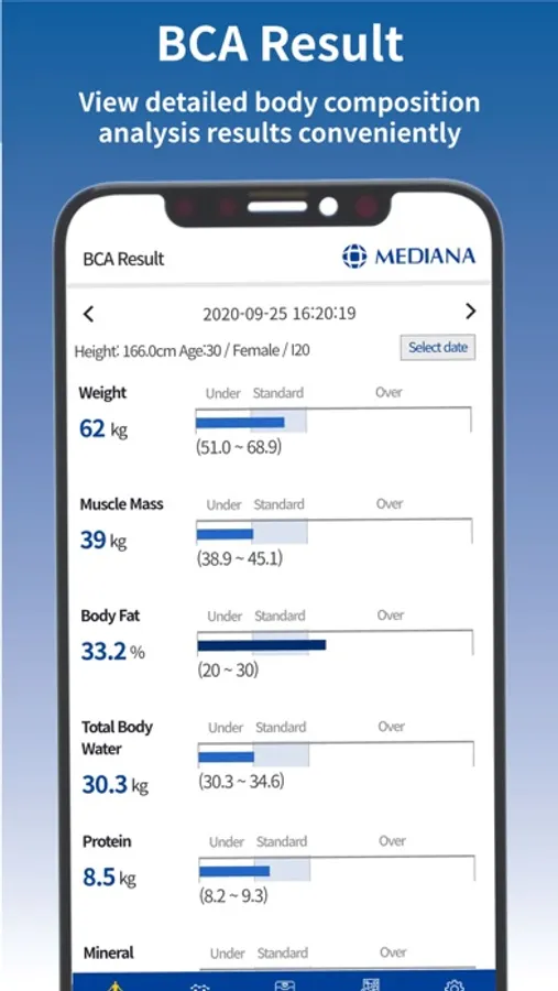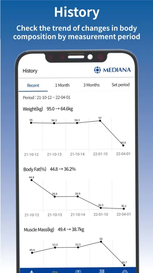 Mediana iApp is for health management that stores the measurement results of Mediana Body Composition Analyzer I series and checks the accumulated data.