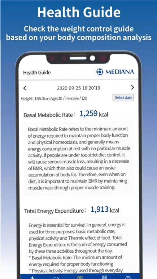 - It provides analysis results that help effective obesity/nutrition management by providing BMR(Basal Metabolic Rate), Total Energy Expenditure, and weight/fat/muscle control guide.