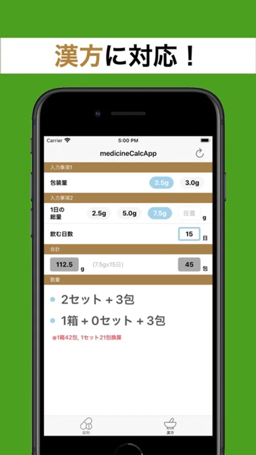 ・「包装量」、「1日の総量」、「飲む日数」の入力で「合計必要量(g)」、「合計包数」を自動計算