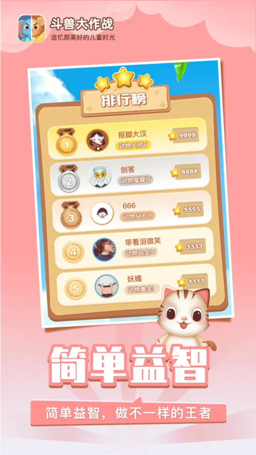 斗兽大作战是一款由斗兽棋纸牌衍生的一款应用,斗兽棋纸牌是80、90后儿时的记忆。心中隐隐约约想起,感觉无比的想念,纸牌斗兽棋赢得了那个时代几代人儿时的喜爱。今天他来了,在手机上你就可以体验到儿时的那种乐趣,上下班路上玩一会儿,轻松一整天。