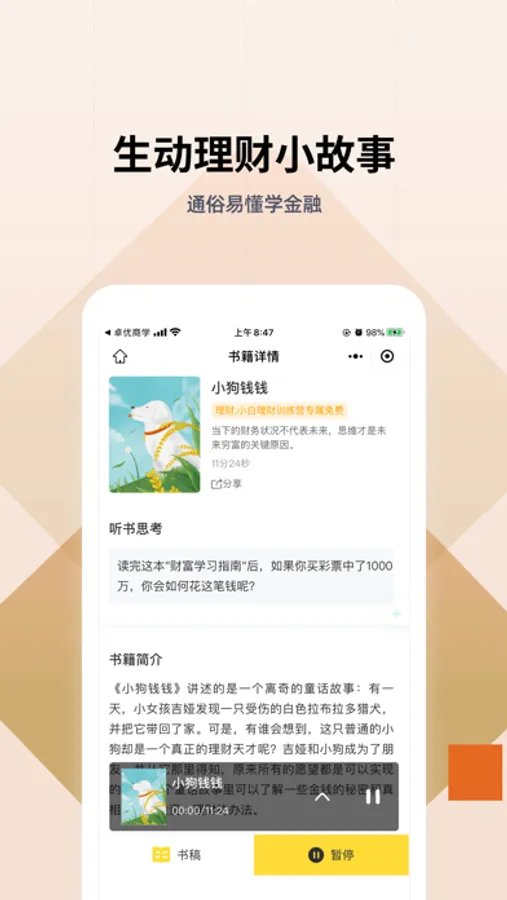 课程内容:涵盖理财意识启蒙、理财知识普及、基金投资、股票投资、保险配置、教育金和养老金、财报分析等内容。