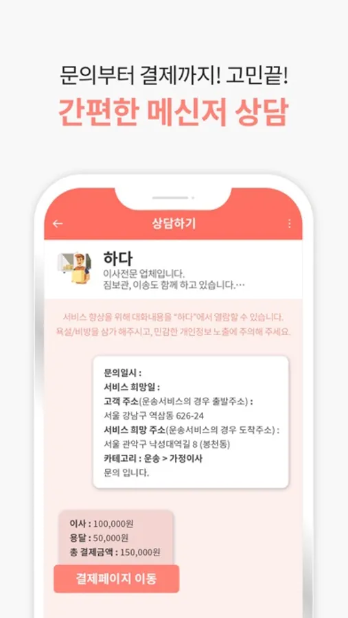 - 메신저 내에서 상담과 동시에 결제가 가능해요! 이제 현금은 안녕~하다에서 원하는 방식으로 자유롭게 결제하세요