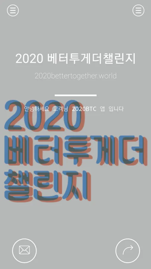 2020년 지구촌은 힘든 여정을 지나고 있습니다. 우리 모두가 가까이하기 힘든 시대적인 어려움에도 ‘더 나은 세상을 꿈꾸는 일’은 계속되어야 하기에 올해도 2020 베터투게더챌린지를 개최합니다. 30일간 온라인으로 진행 될 2020 베터투게더챌린지를 통해 함께하는 방법을 찾고, 아이디어를 나누고, 영감을 주고 받으며 우리는 또 한번 베터투게더의 소중함을 나누게 될 것입니다.