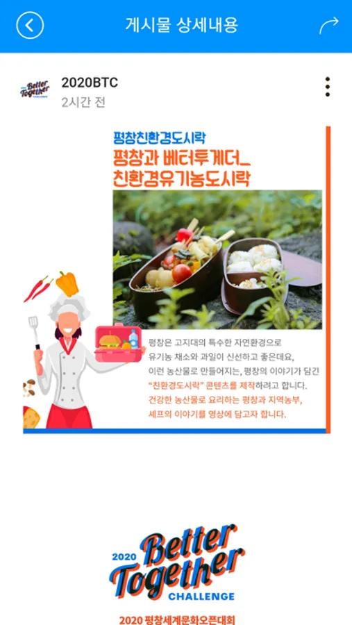 베터투게더챌린지(세계문화오픈대회)는 세계 곳곳에서 자신만의 재능과 방법으로 더불어 행복한 세상을 디자인하고 있는 체인지메이커, 혁신가, 공익활동가들이 모여 오늘날 지구촌 문제들에 대한 다양한 실천사례와 아이디어를 나누는 열린 글로벌 경연대회입니다.