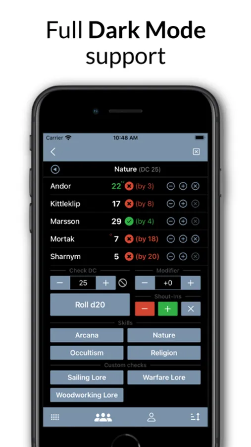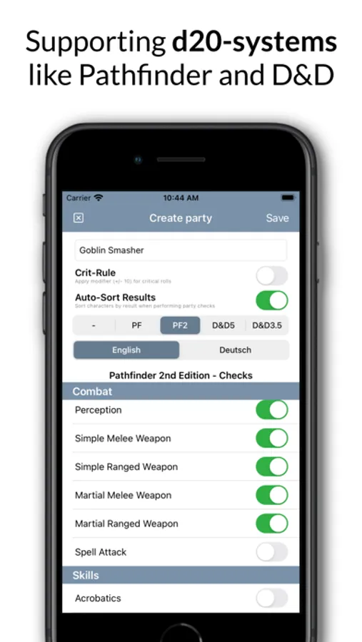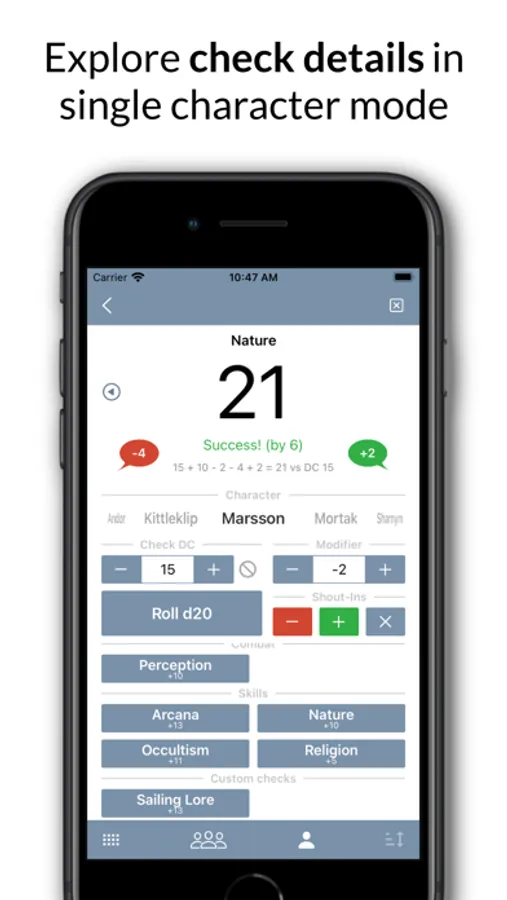 d20 Party Checks is an app for game masters (GMs) of fantasy roleplaying games based on the d20 system, such as Pathfinder or Dungeons & Dragons. Its purpose is to allow the GM to make a secret roll for all player characters within a few seconds. Depending on the play style of the GM, perception checks, knowledge checks, appraise checks, can be made secretly, so as not to burden the players with unnecessary meta-knowledge or even spoiling the game. However, too often in these situations the narrative flow suffers - possibly also the immersion - or already the question "How high is your character's perception modifier?" gives too much away. Most game masters have a piece of paper in front of them on which they have written down all the important skill checks, attribute checks, and saving throws of the player characters and can quickly make the check. However, if it comes to a check for the entire party, quick rolls and comparisons are required for each player character of the group. This is where d20 Party Checks comes in: One click and the result is there - for the whole group!