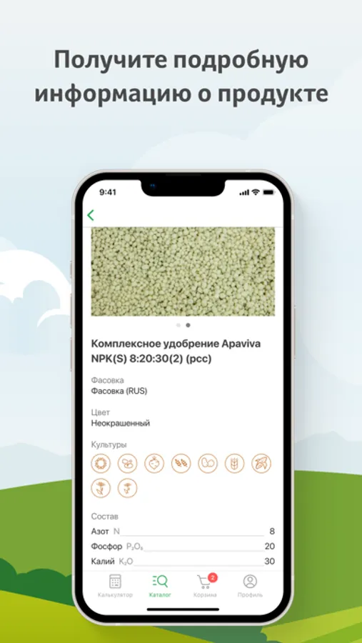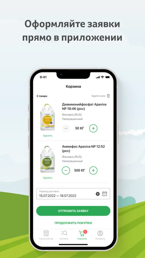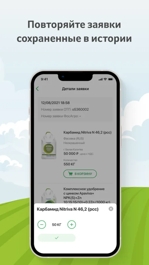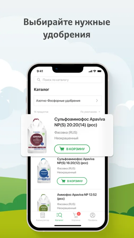 - искать нужные минеральные удобрения в каталоге, формировать корзину и оформлять заявки на покупку