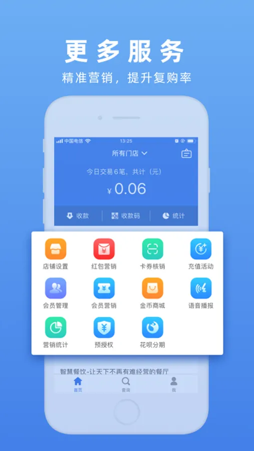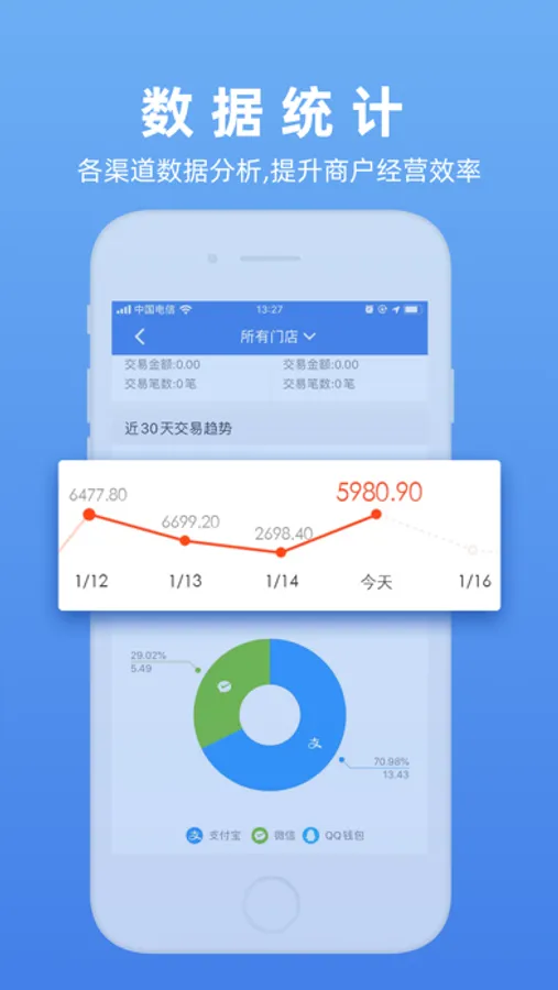 只需免费简单申请,就可以让您 的店铺支付微信支付、支付宝支付,刷卡支付等方式,全方位的解决您的收 银需求。商家帐户开通后,可免费使用我公司的数十款店铺营销与管理软件 ,包括店铺小程序,店铺APP等应用。