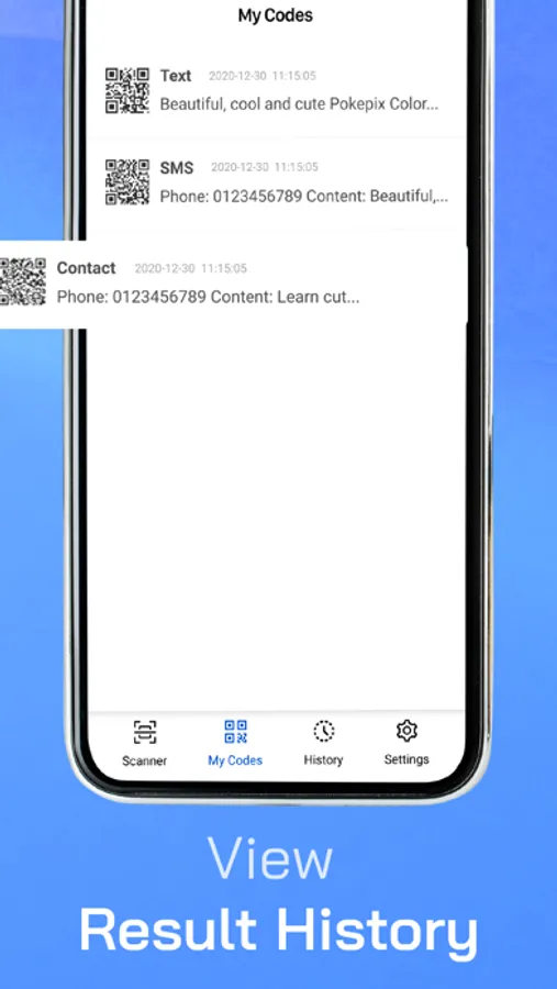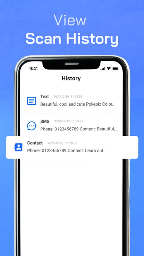 - Scan all types of QR Codes: text, contact, URL, Email, Vcard, SMS, wifi, Image, text message...