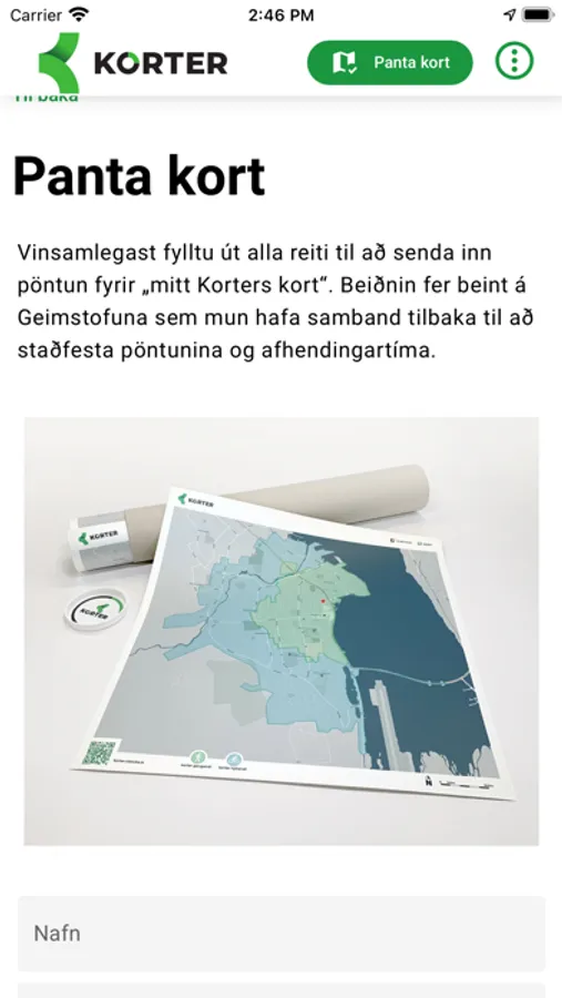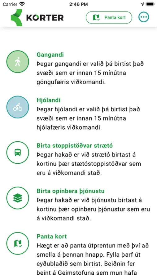 Um leið og forritið Korter er opnað sýnir það svæðið sem tekur 15 mínútur að ganga eða hjóla, út frá viðkomandi staðsetningu. Tryggja þarf að kveikt sé á staðsetningar möguleika í símanum. Eina sem þarf að gera er að opna appið og þá sést strax 15 mínútna svæðið í kring. Hægt er að skipta á milli göngu og hjóla eða sýna hvoru tveggja á sama tíma, einnig er hægt að haka við að sýna leiðarkerfi strætó. Það er einnig stika í appinu sem er hægt að draga til og sýnir mismunandi svæði eftir fjölda mínúta sem eru valdar.