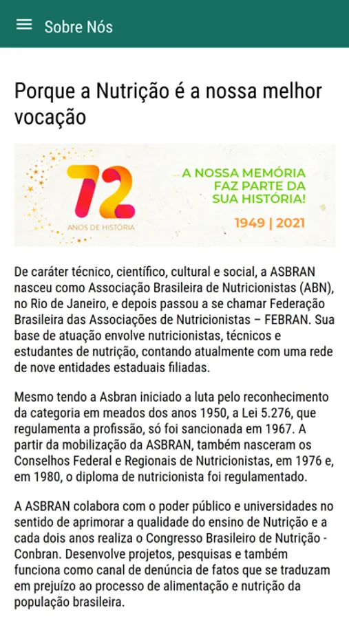 O aplicativo da ASBRAN é mais uma ferramenta que disponibilizamos para aperfeiçoar e facilitar a interação entre o associado e a comunidade de nutrição brasileira. Por meio dele, você tem acesso rápido às novidades da ASBRAN, recebe notificações de eventos importantes da entidade, pode atualizar seu cadastro, ver seu histórico financeiro e muito mais!