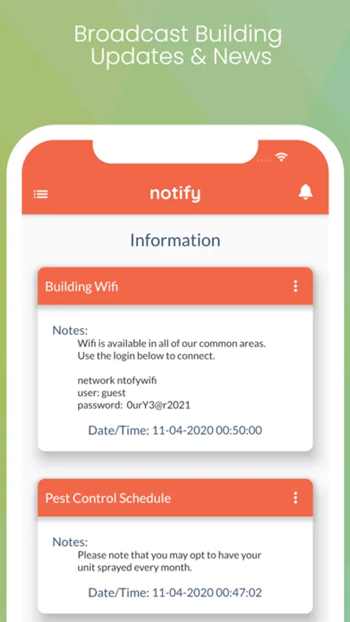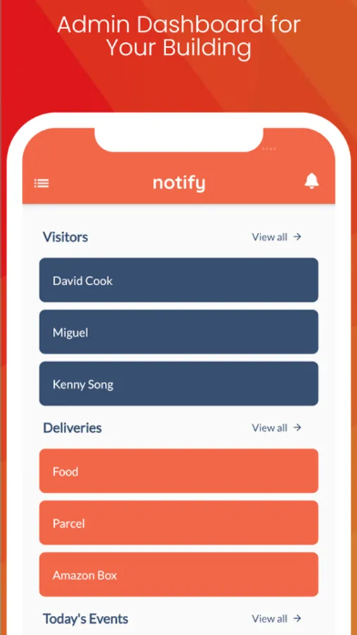 Notify is a building management mobile app for tenants to receive notifications, access info about shared building resources and amenities, request help or maintenance, track mail packages, food deliveries and more. This is the admin edition, if you are a tenant please download the tenant edition