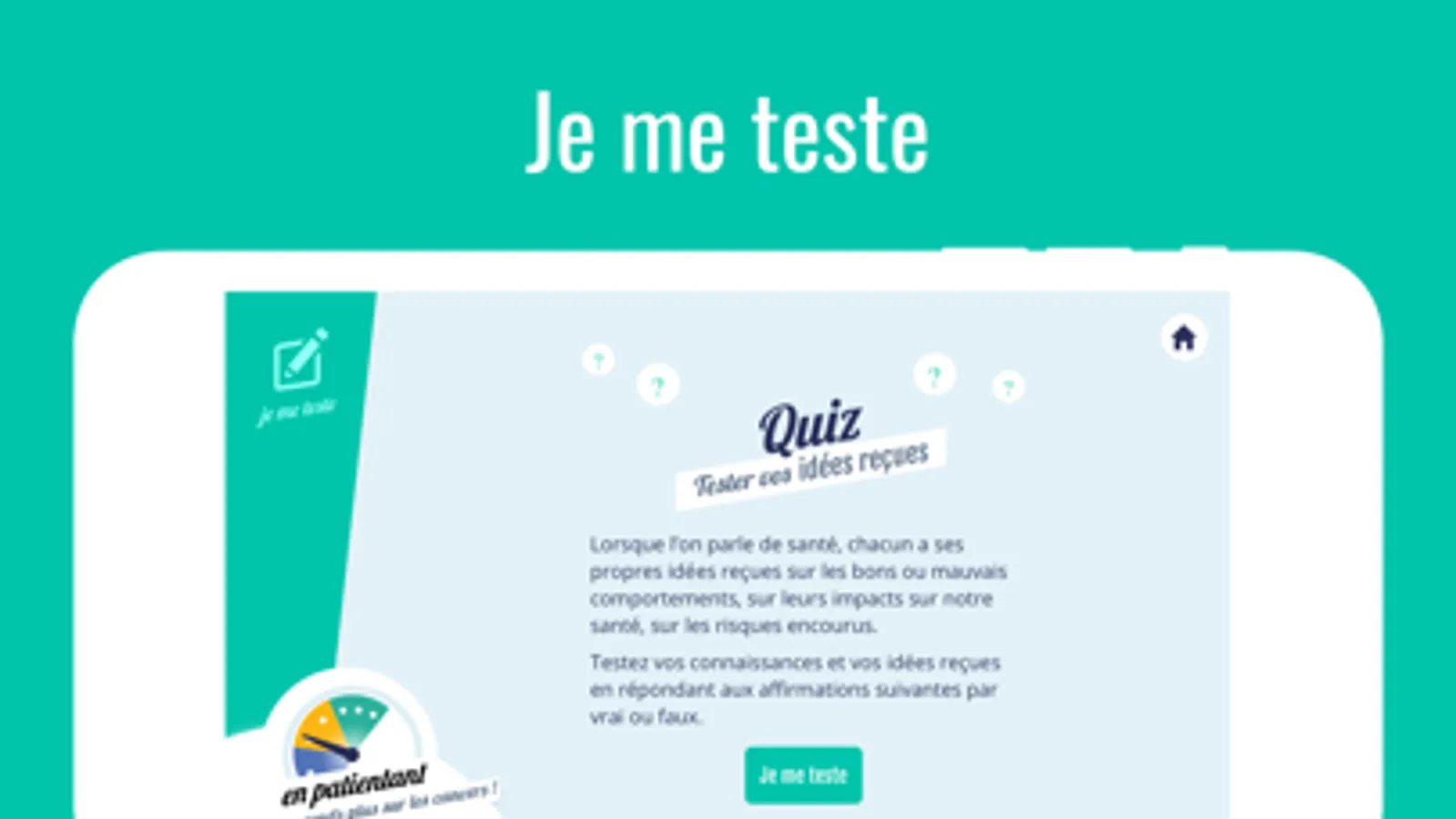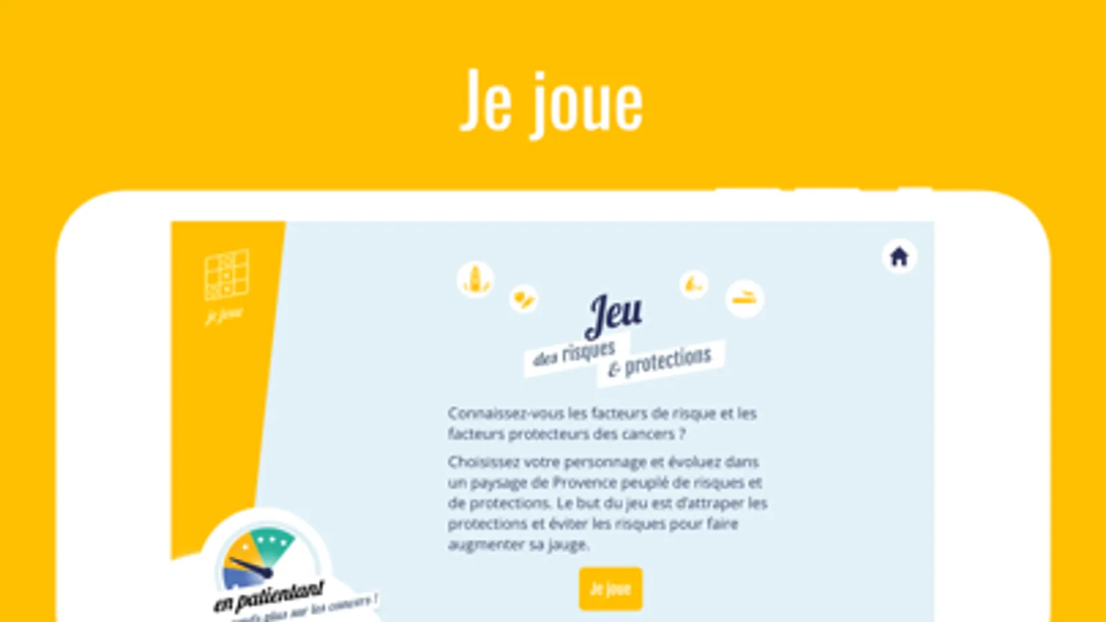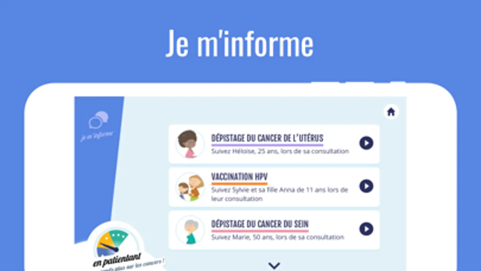 « En patientant … j’en apprends plus sur les cancers » est une application destinée au grand public. Cette application est une extension du site internet enpatientant.fr sur la prévention des cancers et la promotion des dépistages.