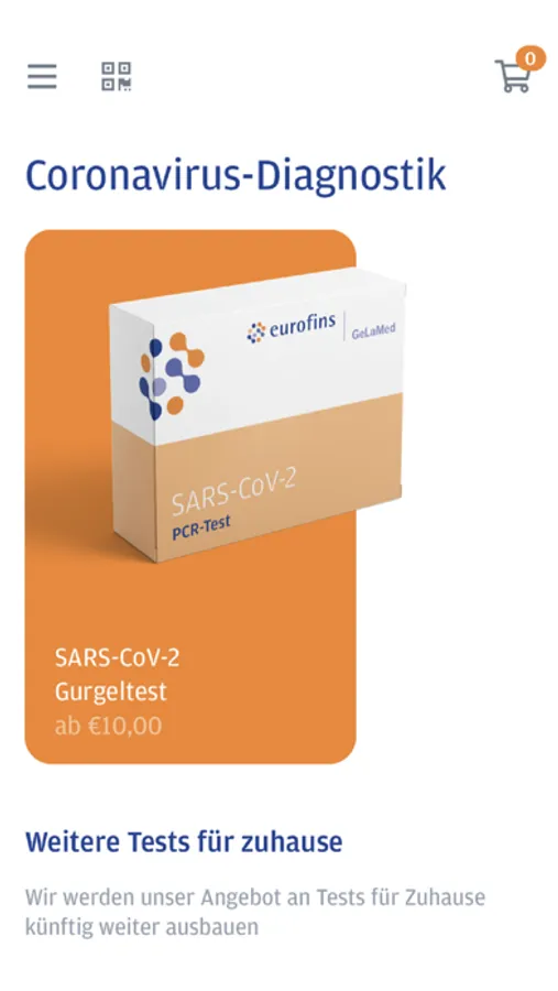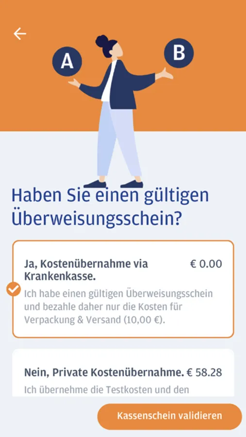 Sie suchen sich den von Ihnen gewünschten Test, bestellen diesen mit Ihrem Überweisungsschein und schicken diesen dann an unser zertifiziertes medizinisches Labor. Das Ergebnis erhalten Sie im Anschluss per QR-Code auf Ihre App.