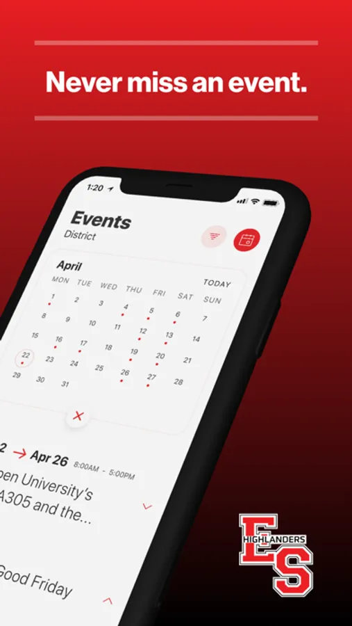 The event section shows a list of events throughout the district. Users can add an event to their calendar to share the event with friends and family with one tap.
