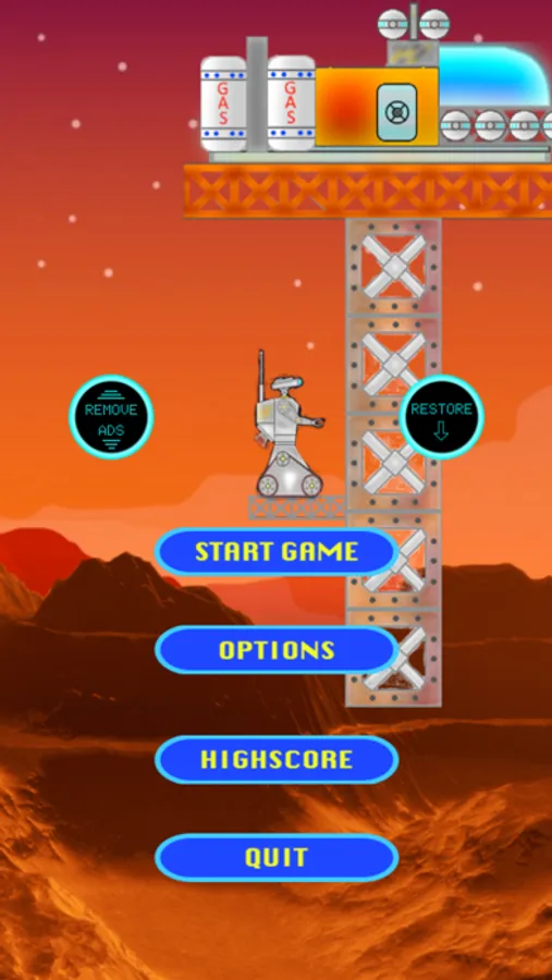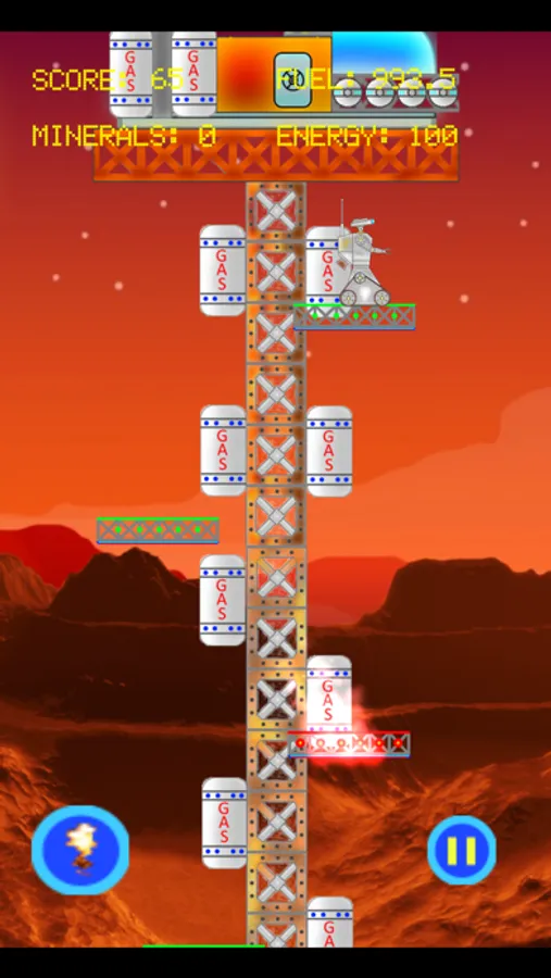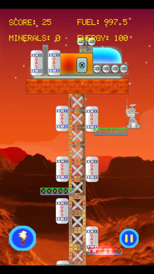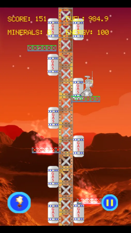 Robot collects Paladium ore and fuel from platforms, bypass burning platforms. Collect as much Palladium Ore as possible
