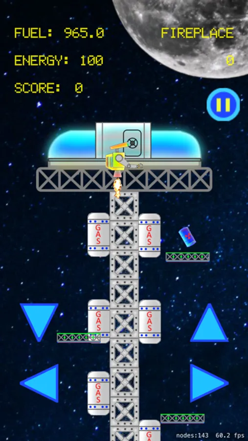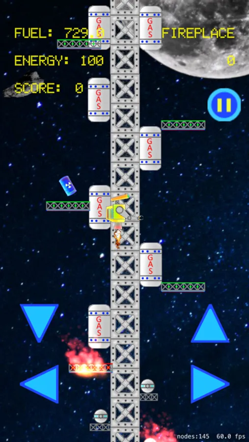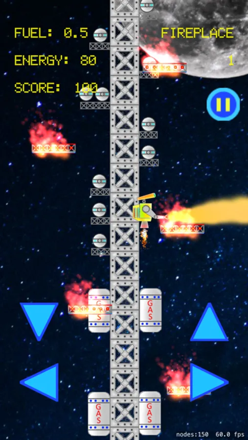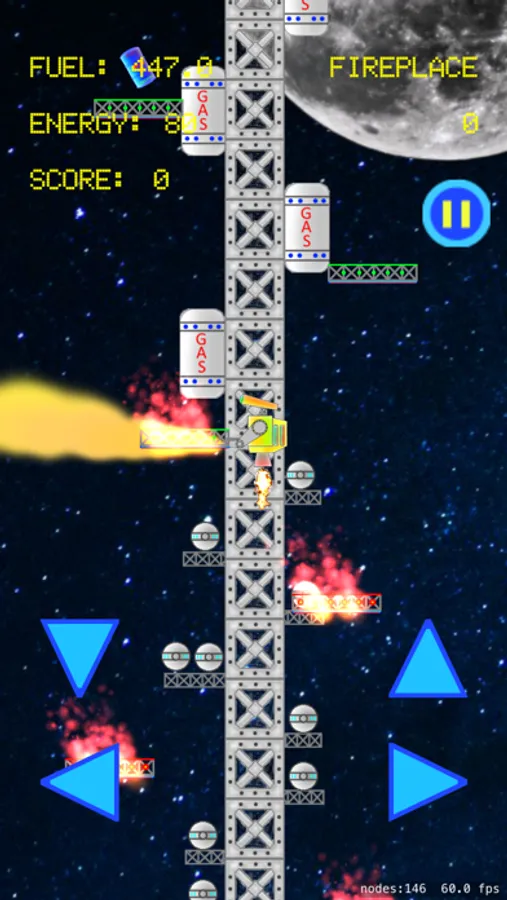 You need to extinguish all burning platforms in the space station, collect fuel, replenish energy and avoid asteroids and meteors