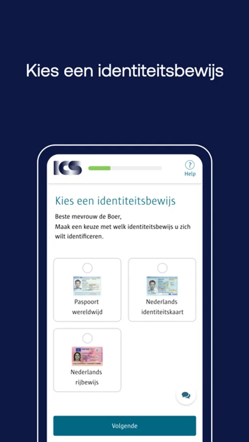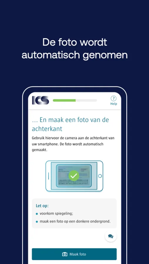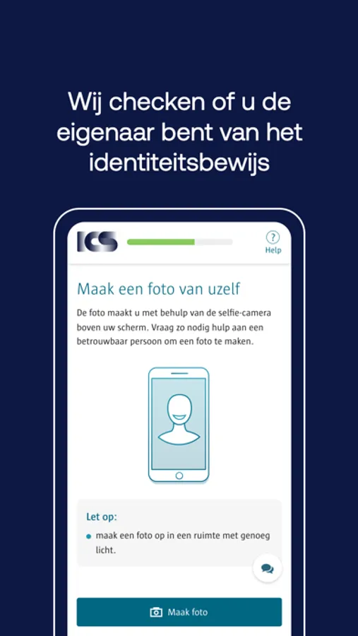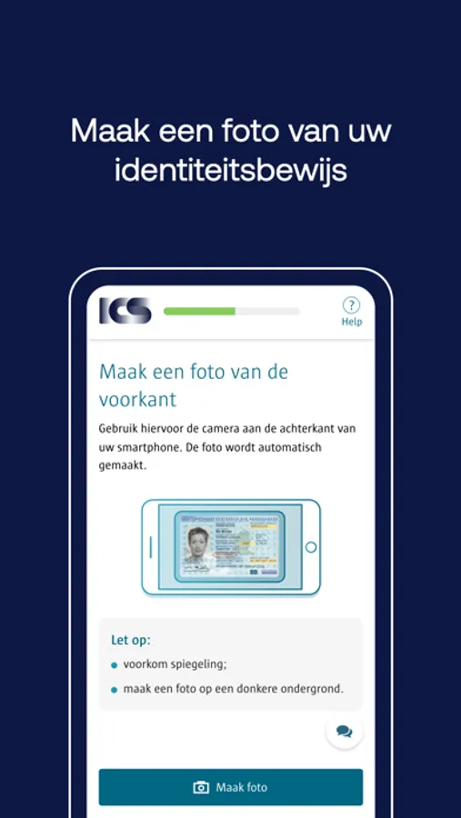 Maak eenvoudig een foto van uw identiteitsbewijs en uzelf met de ICS Identificeren app. Identificeren is nodig voor het aanvragen van een ICS creditcard.