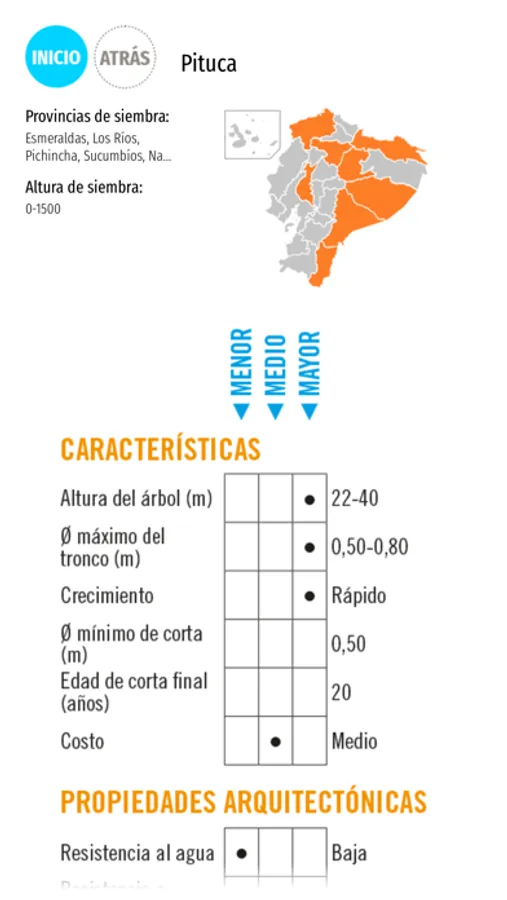 En el Catálogo de Madera Estructural del Ecuador usted puede navegar entre las principales especies comercializadas dentro del territorio ecuatoriano, pudiendo encontrar las especies por varios criterios de búsqueda: por provincia, por nombre comercial, por altura de siembra, por tonalidad promedio, entre otras.