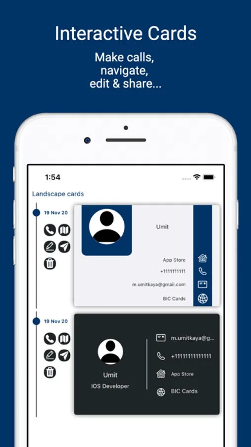 - Interactions by single tap (e.g driving to address on card, make a call, edit, delete or share anytime)
