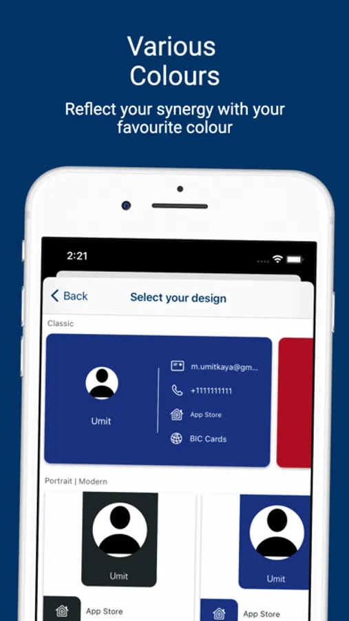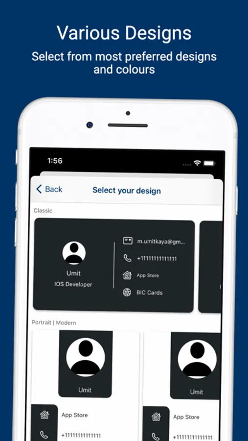 Interactive business cards app is the way to create free digital business cards in seconds. You can make your own business cards in different data sets and styles and store in your card holder to share anytime, as well as, receive cards from other users and keep them all in your special space in the app called "Card Holder".