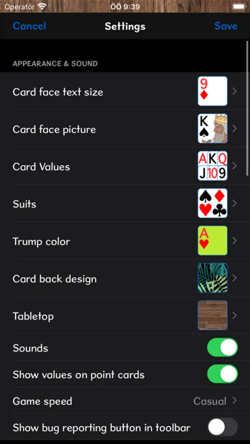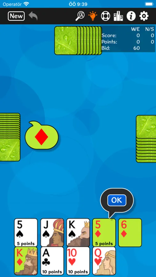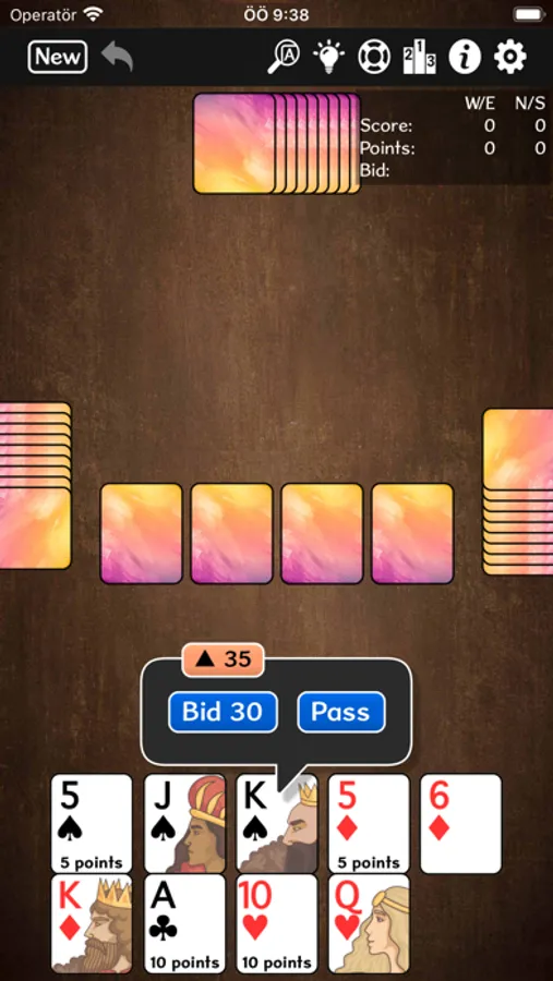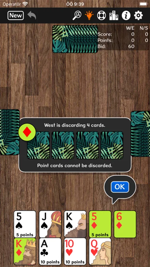 No ads, no tracking. Barouche is a trick-taking card game popular around the world. It uses a standard deck, but with 2s, 3s and 4s removed. Four players form 2 teams, with partners sitting across from each other. Each player is dealt 9 cards, plus 4 cards for the widow in the middle of the table. An auction bid begins at 30, for the right to name the trump suit. The high bidder swaps out cards with the widow, then leads a trump. During the tricks phase, Aces are high, 5s are worth 5 points, 10s and Aces are worth 10 points. The other cards are worth nothing. The high bidder's team needs to meet or exceed its high bid.