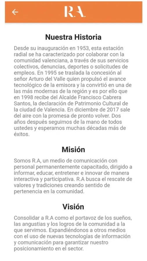 Somos R.A, un medio de comunicación con personal permanentemente capacitado, dirigido a informar, educar, entretener e innovar de manera interactiva y participativa. R.A busca el rescate de valores y tradiciones creando sentido de pertenencia en la comunidad.