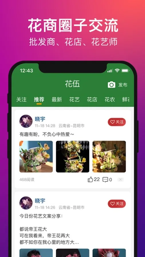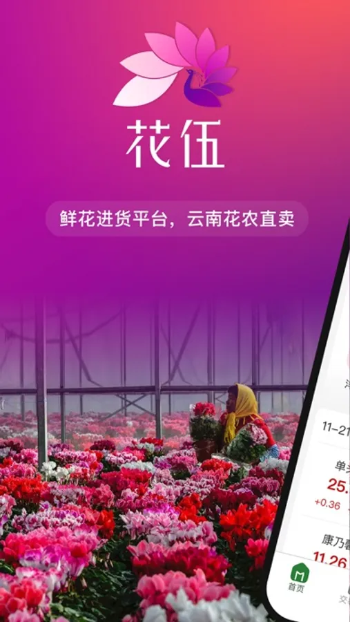 花伍——花田直发的云南鲜花批发平台。花店在这里可以找到云南昆明斗南的鲜花货源,鲜花配送到全国各地鲜花批发市场,为花店进货提供便捷的体验,还可查询鲜花速递物流信息;同时花店可以在花商圈子里获得插花教程、花艺培训、花店经营、花卉绿植养护、花礼、节日花语等信息!