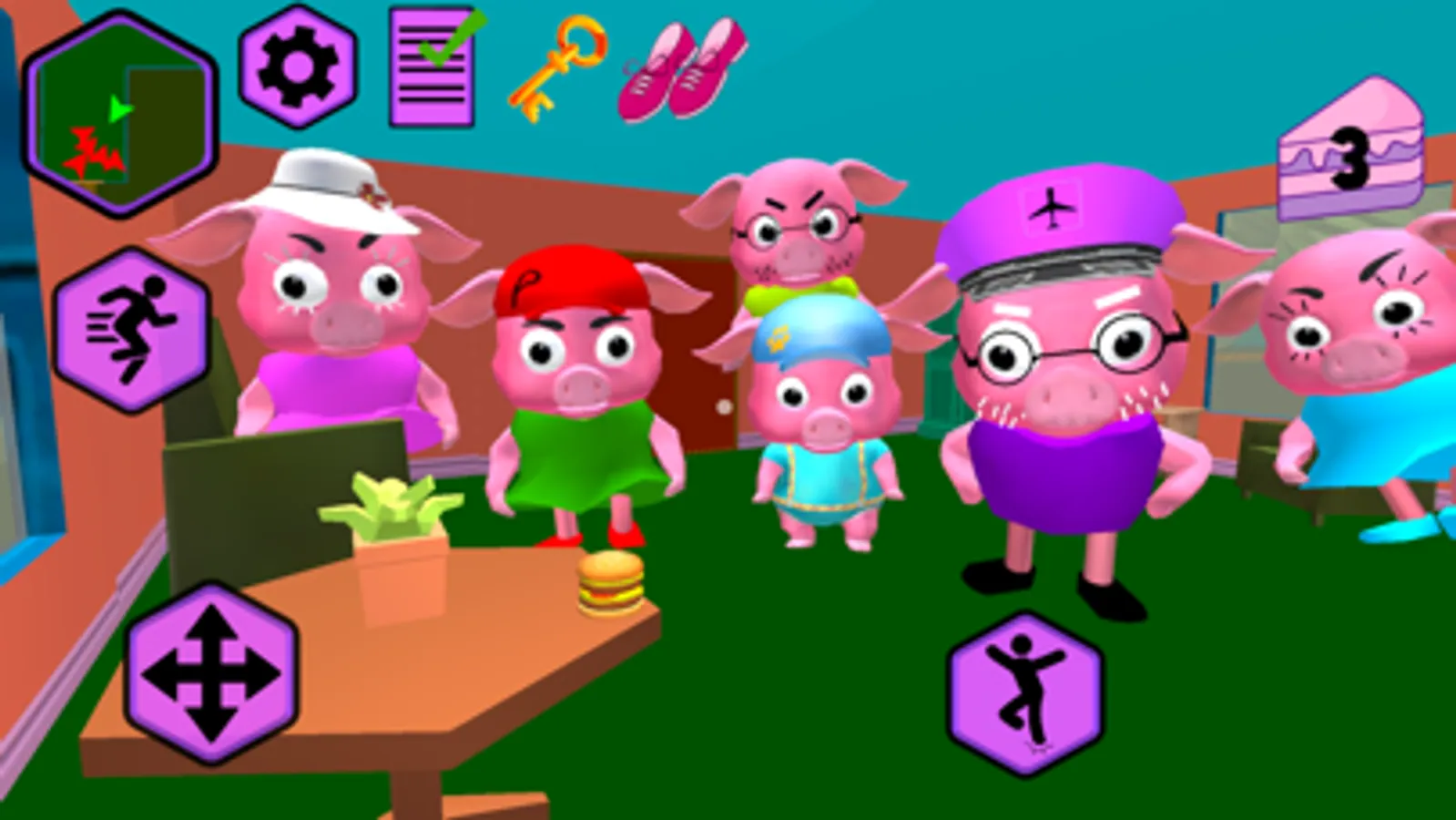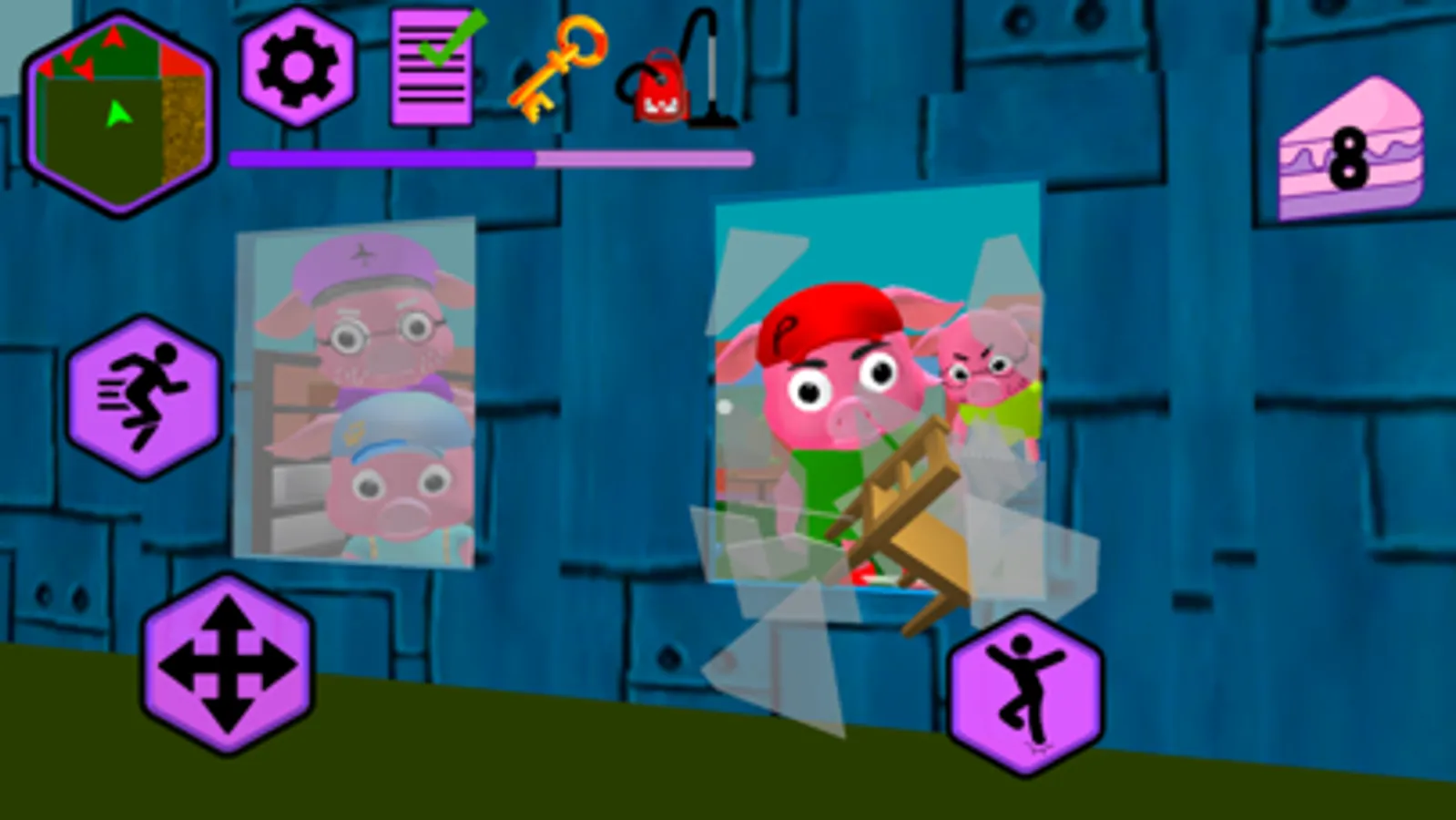- Popular Escape gameplay! Explore the huge piggies’ house, seek for useful objects, throw objects at the enemy for stunning and at the windows to break them!