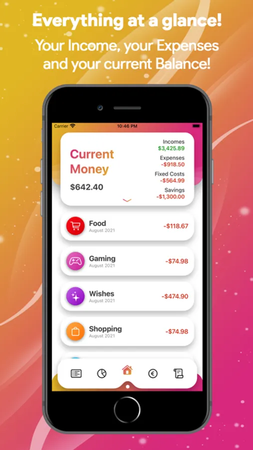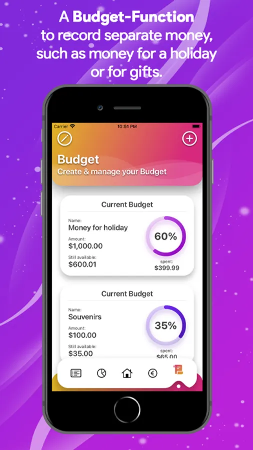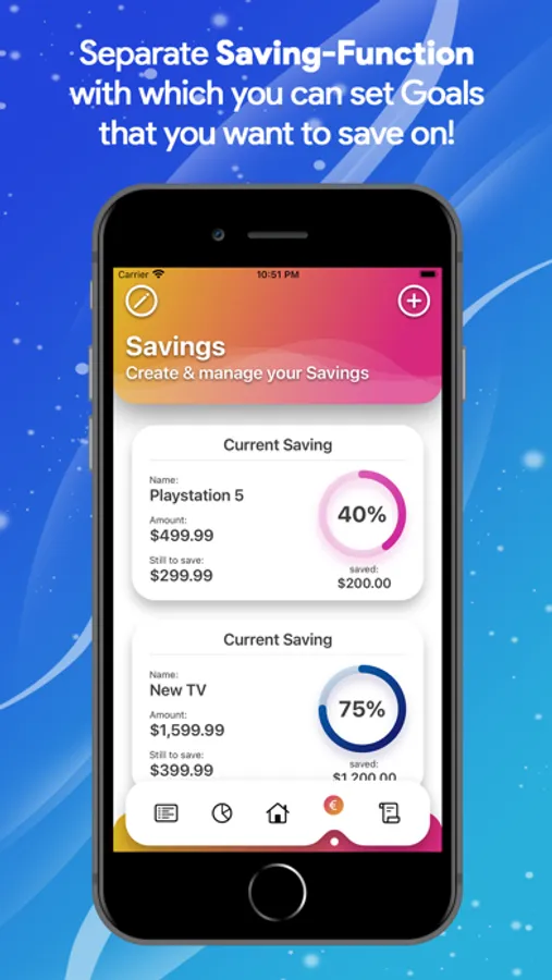 - Separate saving function in which you can define a savings goal and record every money you put aside for it.