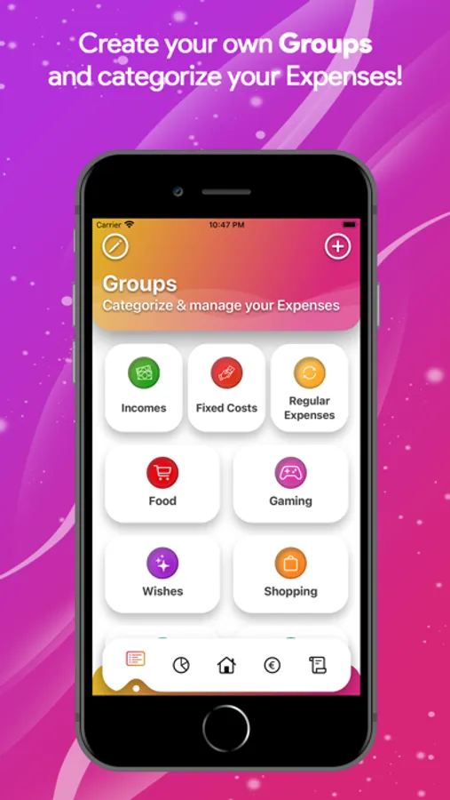 - Self-defining category groups for your expenses (such as purchases, gas or pets). So you can separate them all and you get a much better overview.