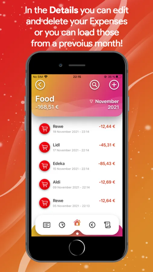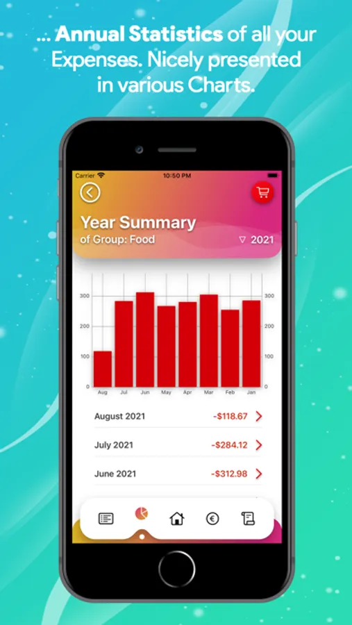 - Monthly statistics of all expenses for the current and last month, but also annual statistics for all past months, nicely presented in various charts. So you can easily compare the expenses of the current month with those of the last month, or see an approximate trend of how much money you are spending in each group per month.