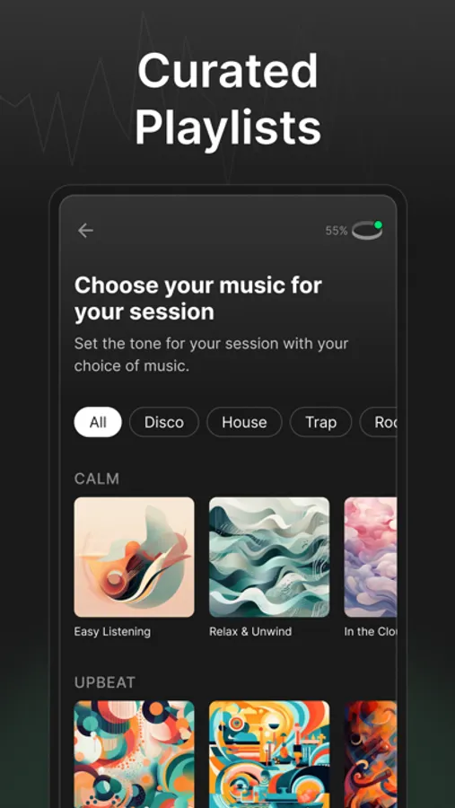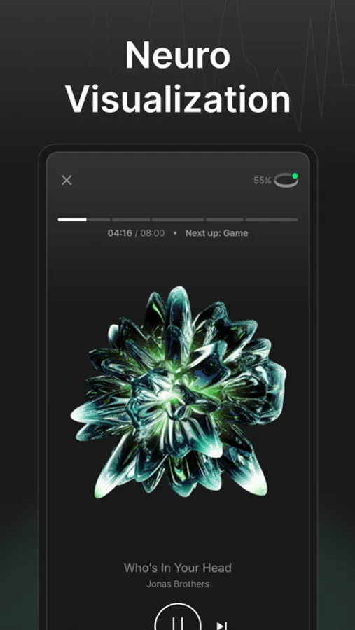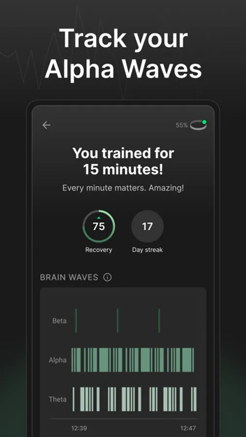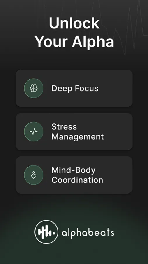While you're listening to music, we apply a gentle audio layer that continuously responds to your brainwaves in real-time. We'll make subtle changes to the intensity of the music to train your brain to relax and slide into the alpha-state, also known as a flow state..