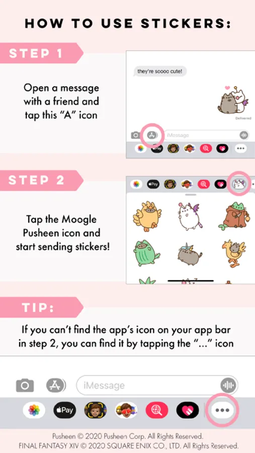 TIP: If you can’t find the icon in step 2, scroll right in your app bar until you see the “…” icon and then tap it to bring up a full list of your iMessage apps. You will be able to select the Moogle Pusheen icon from that menu.