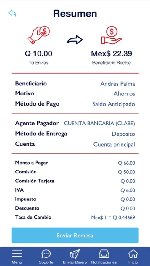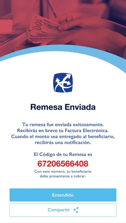 5. Espera la notificación de confirmación para iniciar a enviar dinero a través de RCH App.