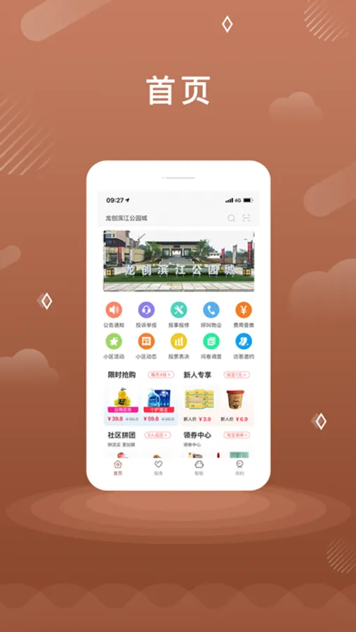 滨江公园城整合了停车管理、可视对讲、门禁管理、定位巡更、视频监控、通道管理等一系列管理体系,包含物业缴费、在线投诉、在线报修、服务预约、外卖团购、社区活动等功能。